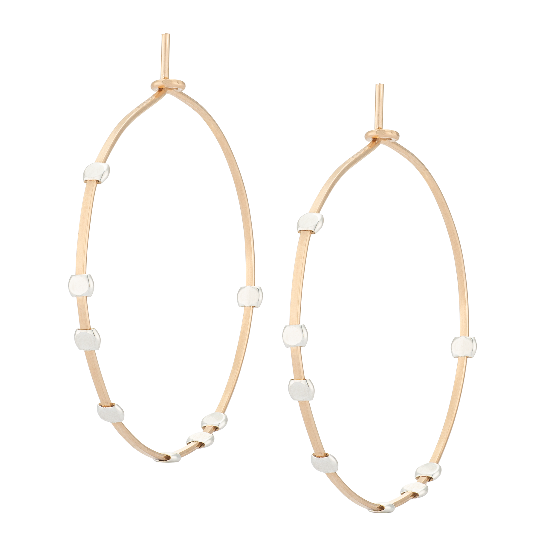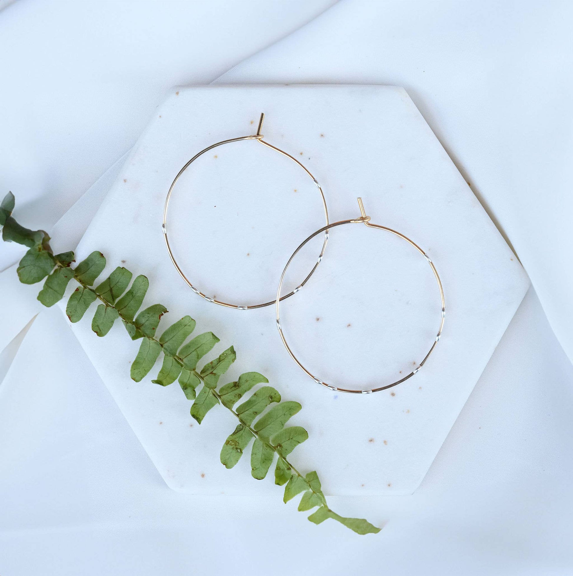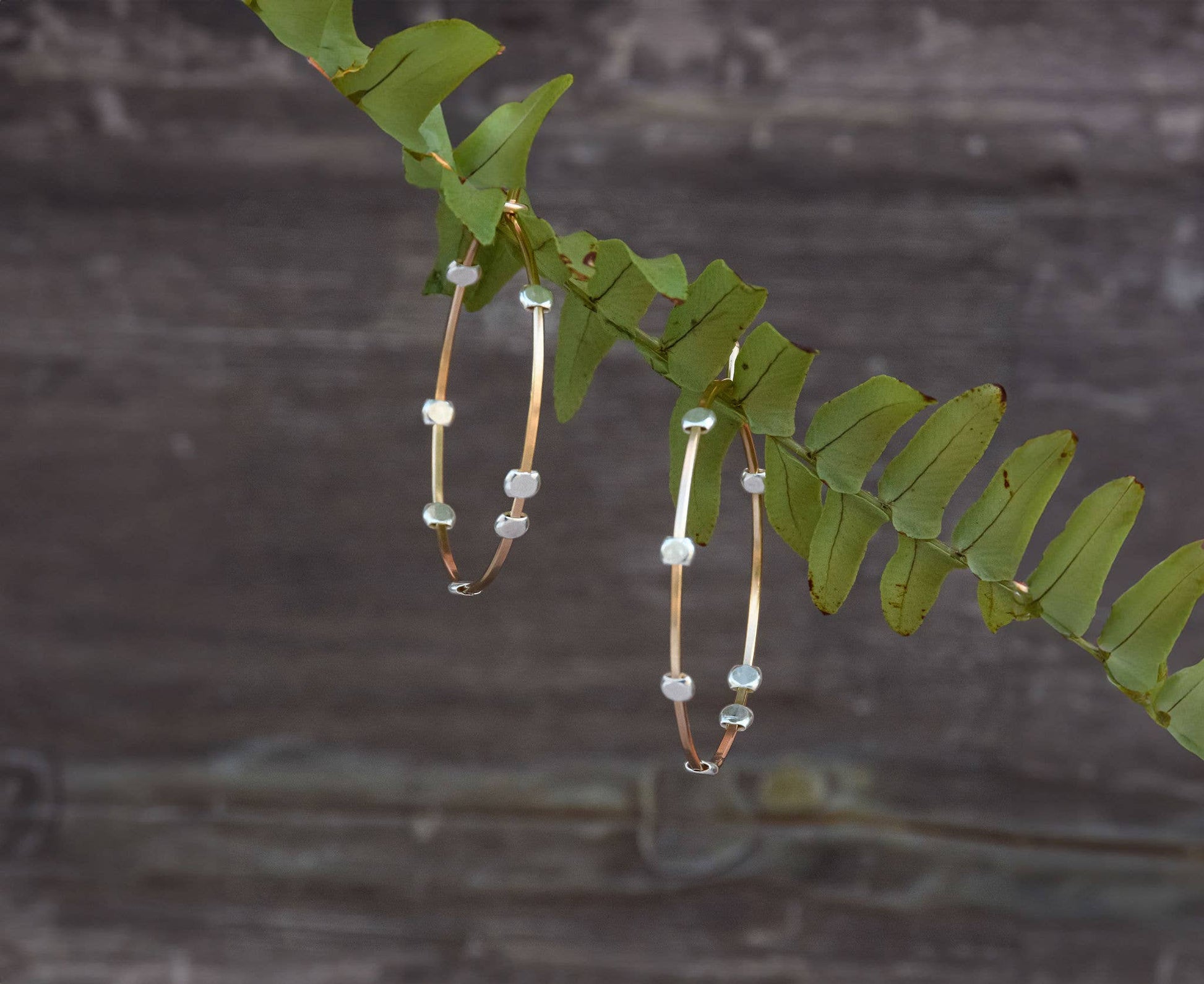 These gold filled wire hoops feature sterling silver dots. These earrings are hand formed and hammered by hand, each pair bring a piece of the night sky to your wardrobe. 1.25" in diameter
