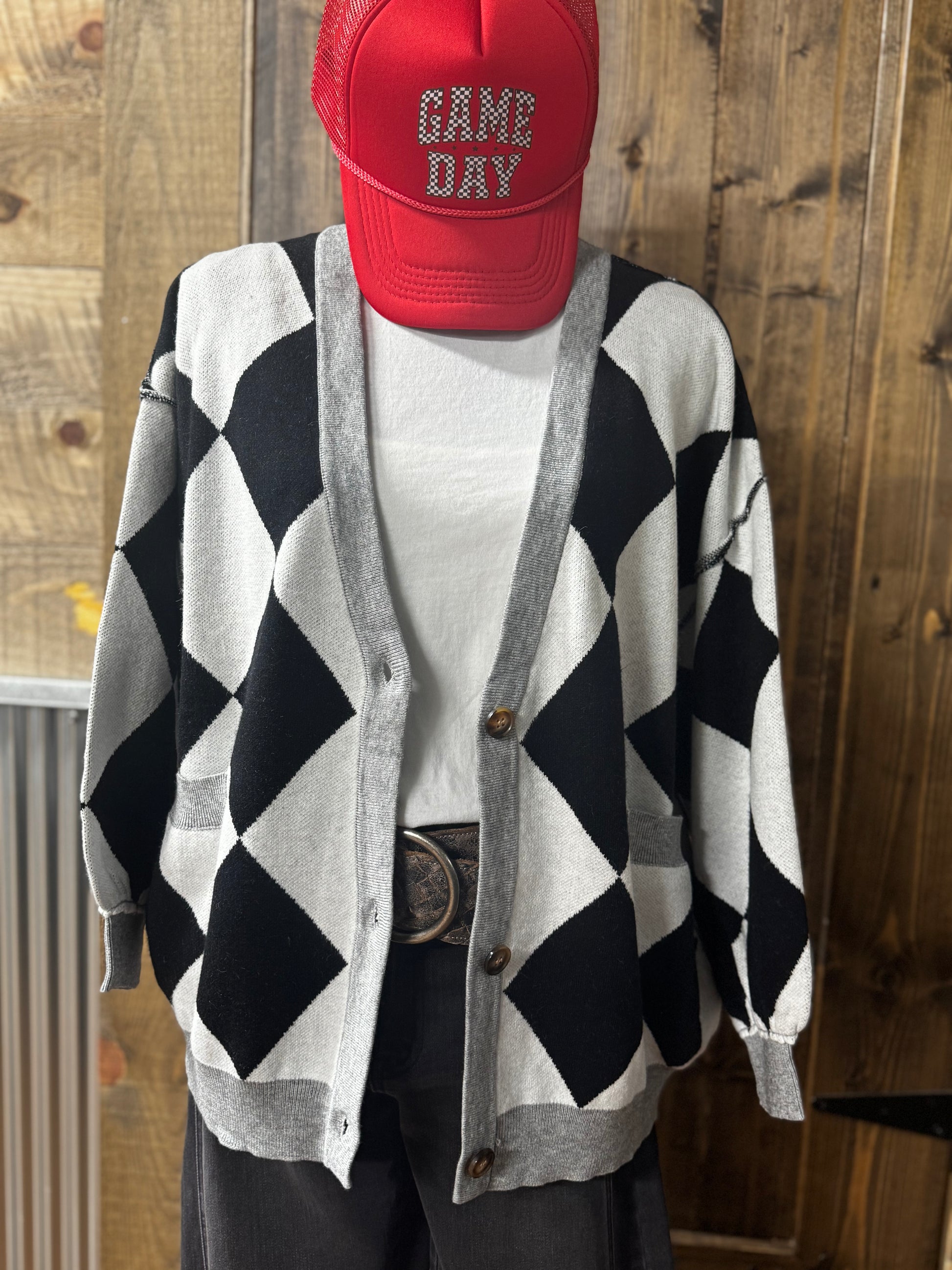 Turn heads in this vibrant oversized cardigan featuring a bold diamond